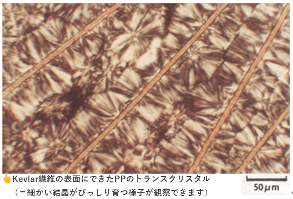 たとえば、鉱物系の添加剤「タルク」は、PPにとっての結晶核剤の代表格。また、強化繊維の表面でも結晶ができやすくなり、それを「トランスクリスタル効果」と呼んでいます。