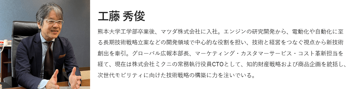 白縁メガネの奥に穏やかなまなざし。マツダで数々の開発を手がけ、現在はミクニのCTOとしてモビリティのこれからを描く工藤秀俊氏。経歴から想像する“ストイックなエンジニア像”とは違い語り口は驚くほどやわらかい。研究開発に加えて、バリューチェーンにおける様々な領域の経験をもとに、共創を通じて育む“技術と人の本質”とは―ミクニが描く未来、そして次世代のエンジニアへ託す思いを伺いました。